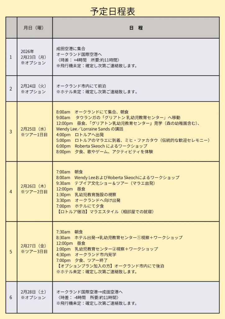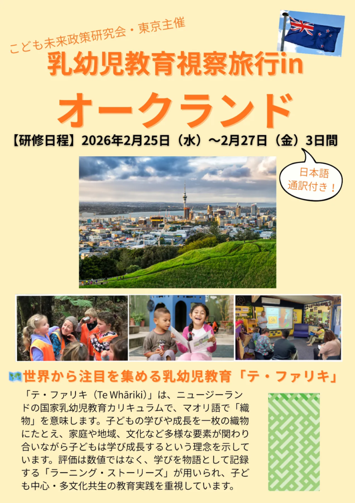2026年2月、ニュージーランド・オークランドにて、「乳幼児教育視察旅行 in オークランド」研修が開催されます。