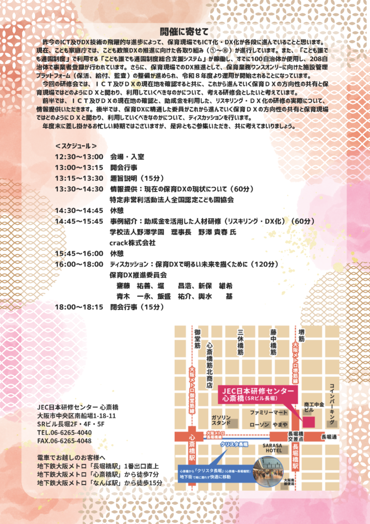 今回の研修会では、ICT及びDXの現在地の確認すると共に、これから進んでいく保育DXの方向性の共有と保育現場ではどのようにDXと関わり、利用していくべきなのかについて、考える研修会としたいと考えています。