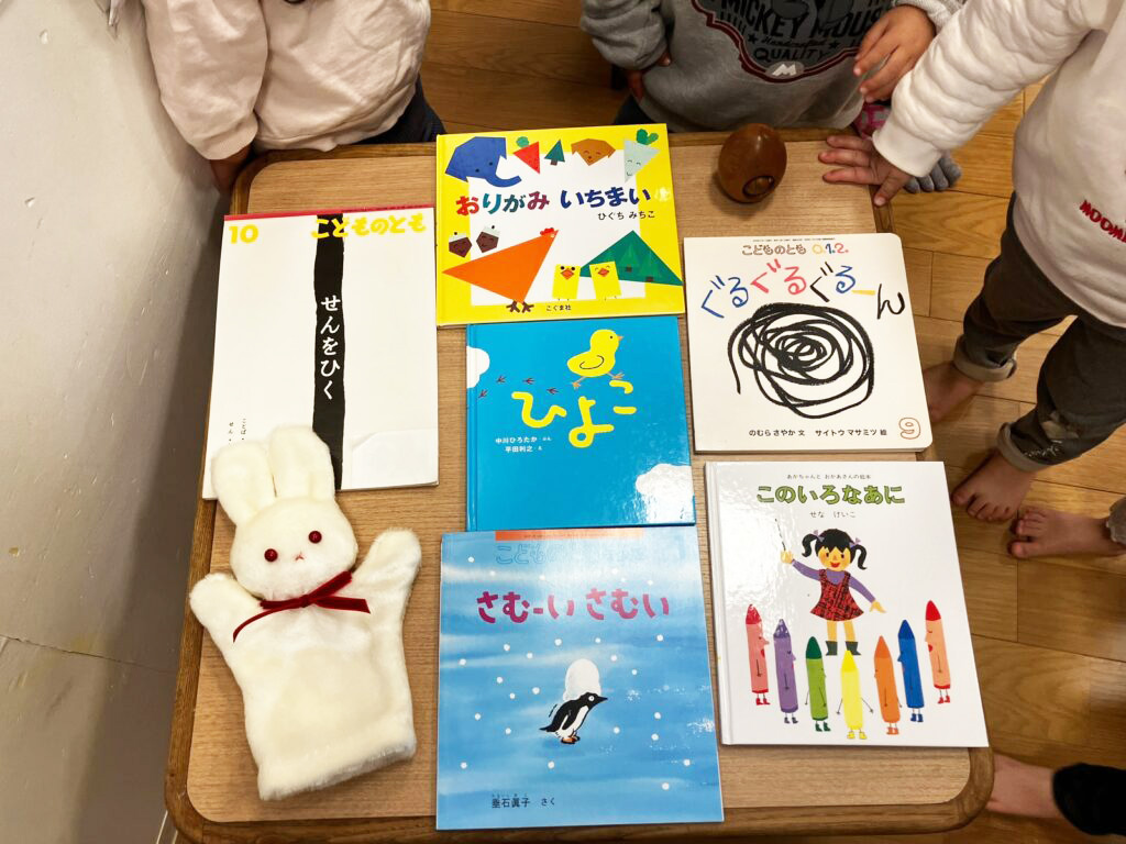 新年初めてのおはなしポンは、動物や色、線などの絵本を読み聞かせてもらいました。わらべうたにも触れ、最後は子どもたちの中でお気に入りの絵本を選ぶ姿も見られています。