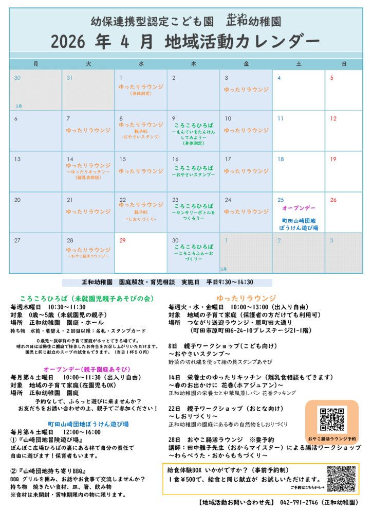 【正和幼稚園】2026年4月 地域活動カレンダーのご案内
