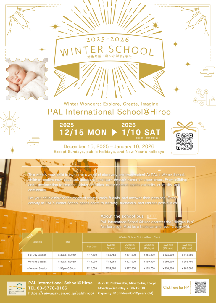PALのウィンタースクールでは、子どもたちが新しいアイデアに出会い、質問し、体験を通して学びを深めます。制作や実験、冬ならではのアクティビティなど、すべての瞬間が好奇心・創造力・自信を育みます。