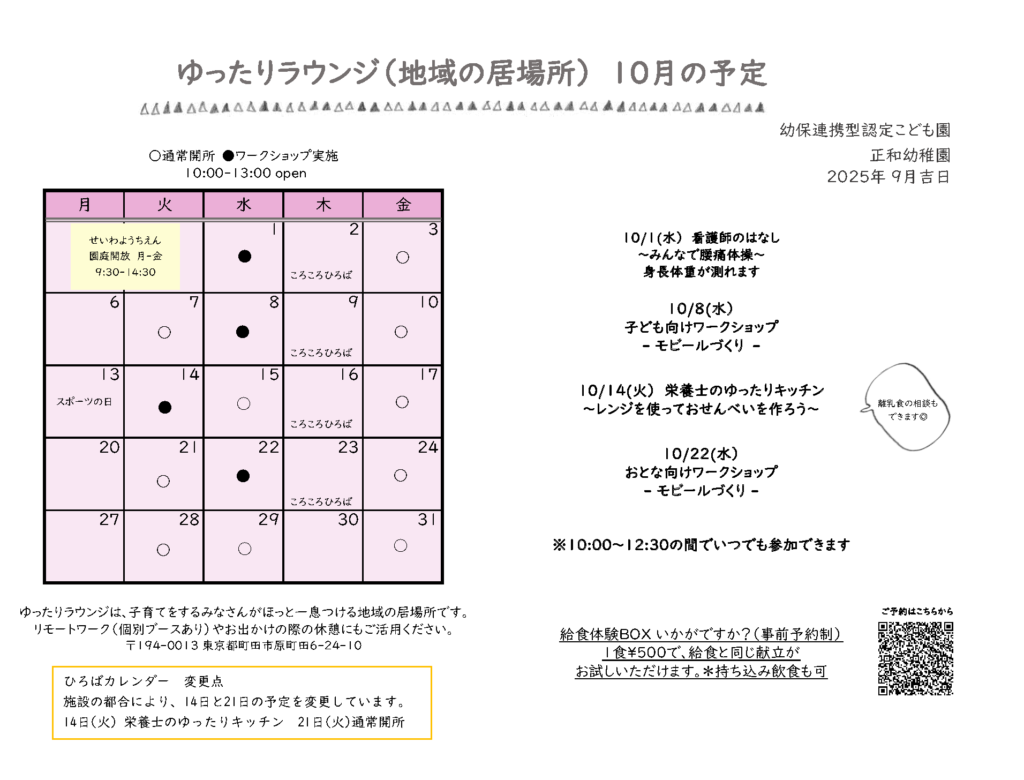 10月は、栄養士によるゆったりキッチンや親子向け・大人向けのワークショップなどを実施します。