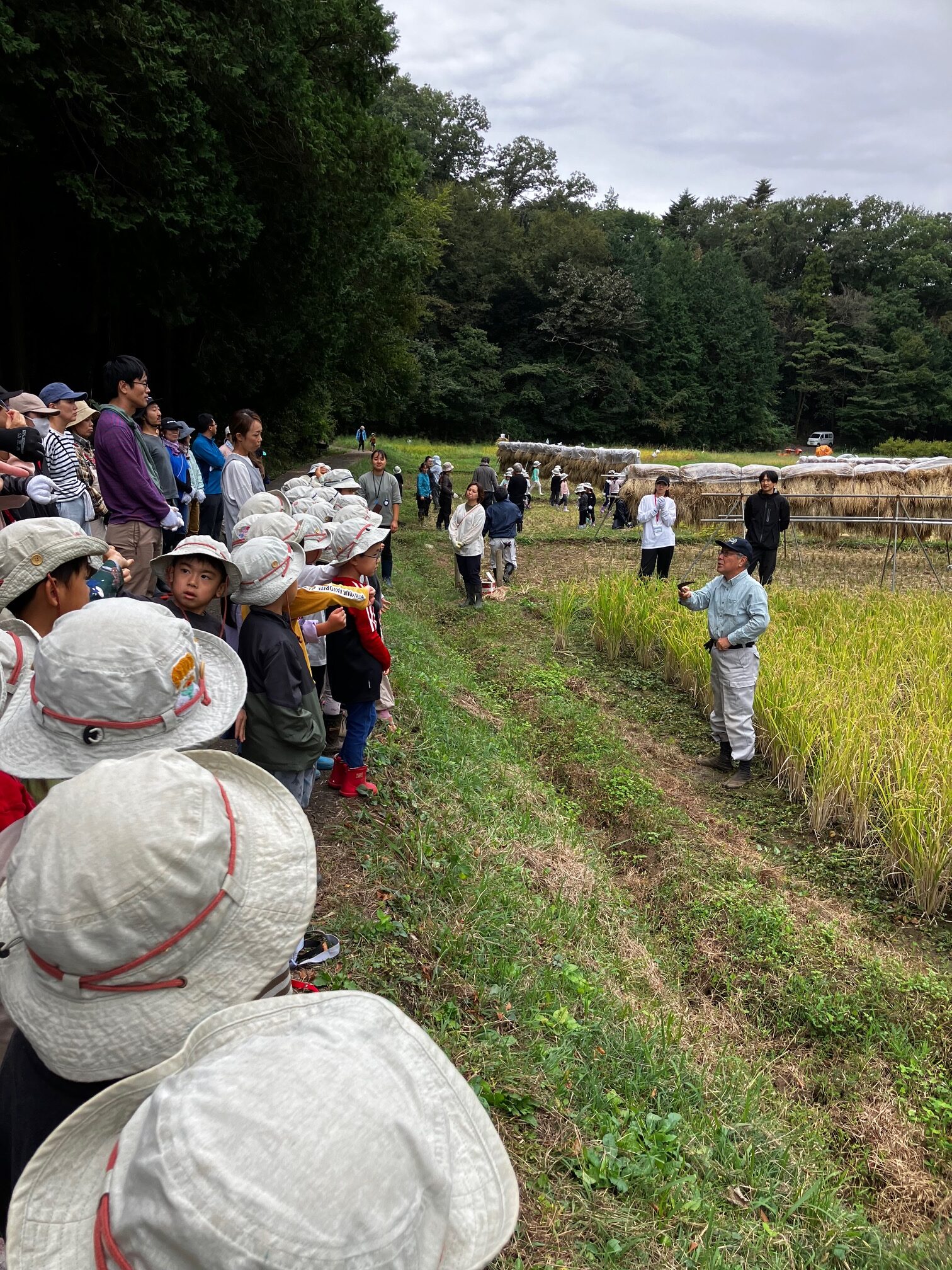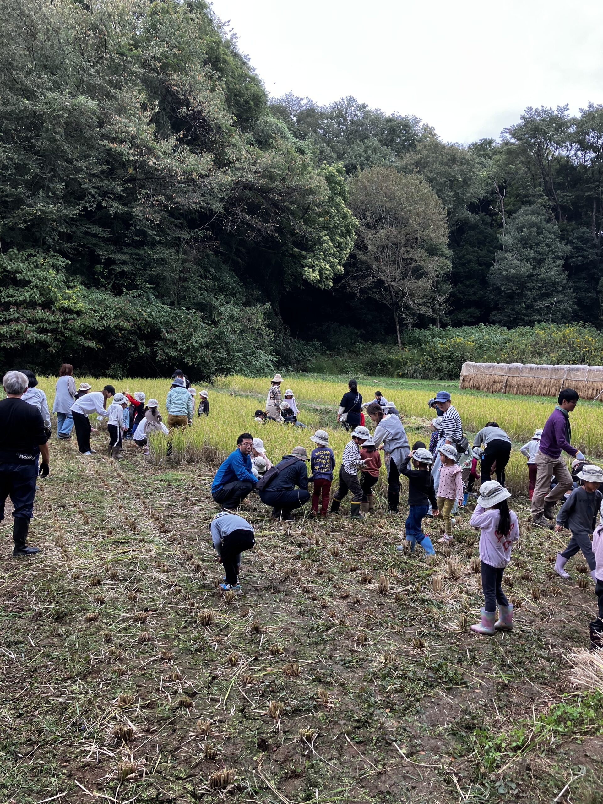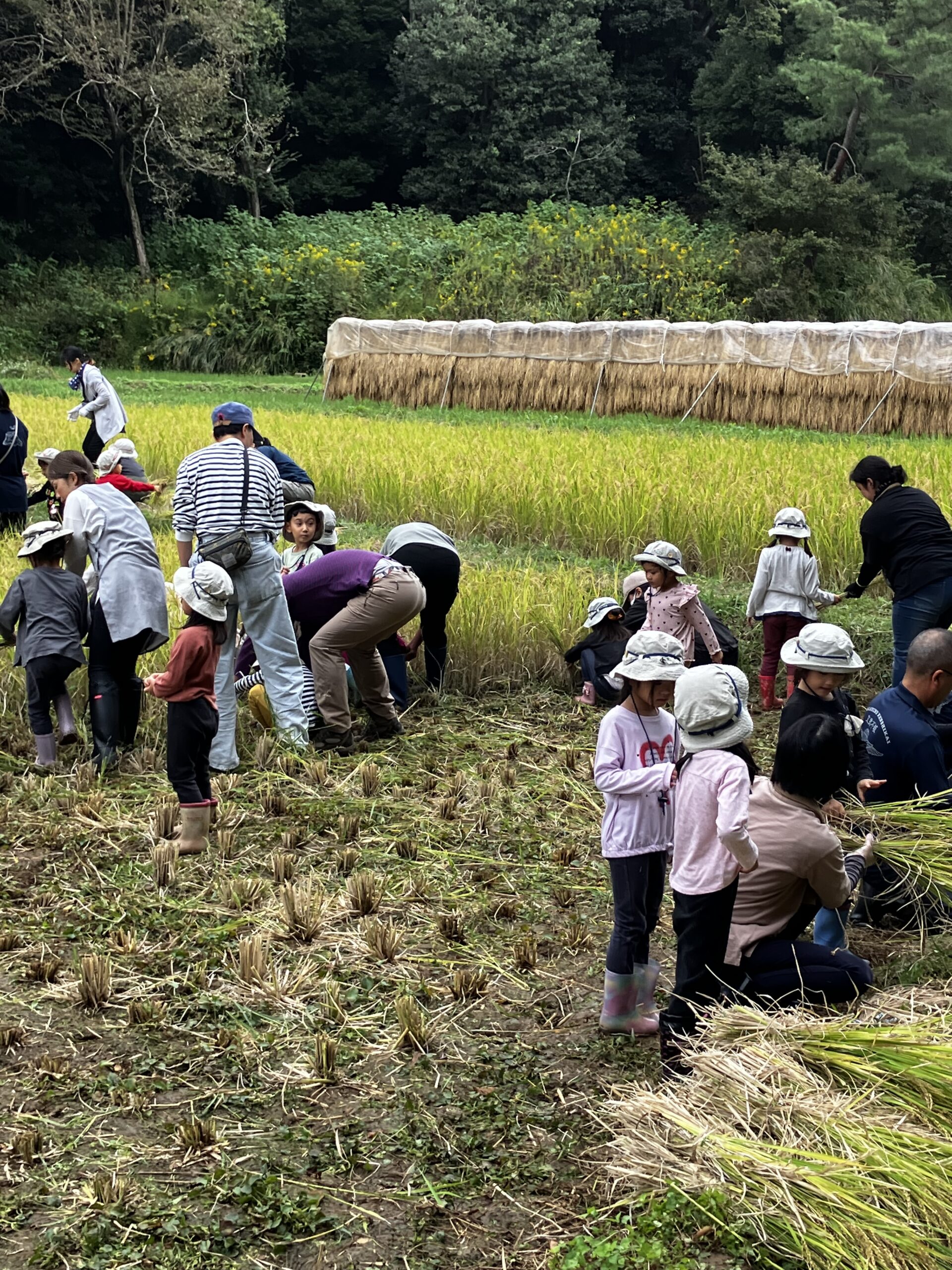 刈った稲は、保護者の方や、職員が束ねて「まるけ」ます。それを「はざかけ」して乾燥させます。大地の実りに感謝。そして、ゆっくり、じっくりと乾燥させることで、お米はおいしくなるのだそうです。1か月くらい干したら、次は脱穀。「『だっこく』って何するんだろう?」次も楽しみ。