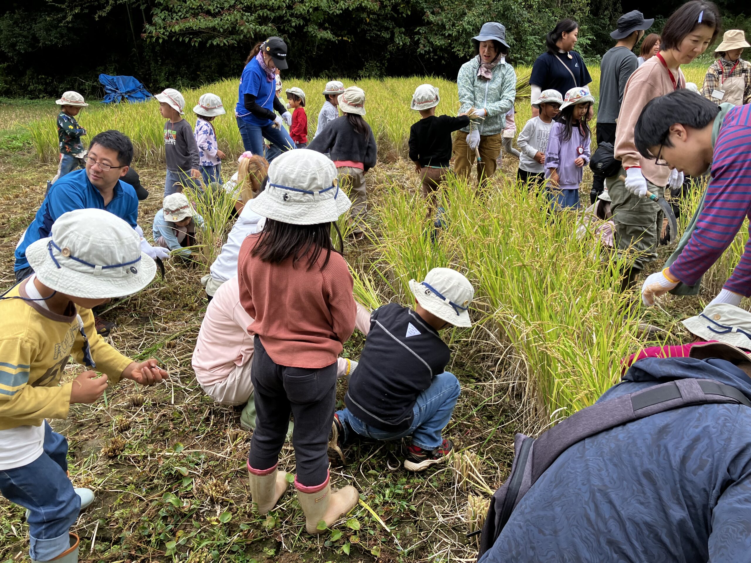 町田自然幼稚園では、ホンモノの鎌を使って稲を刈っていきます。親指を下にして、稲をつかんで…鎌を手前に引く、親指は「下」で握ってね、ケガしないようにね、としっかりと注意を聞いて。順番、順番。