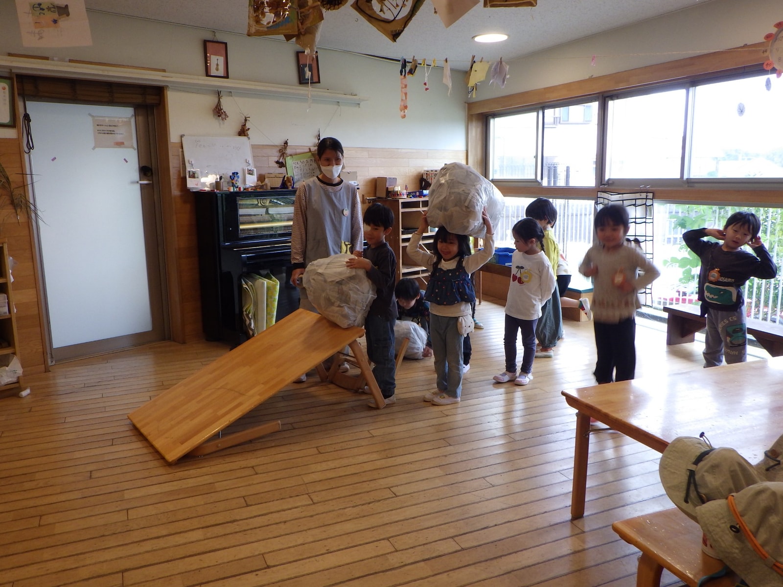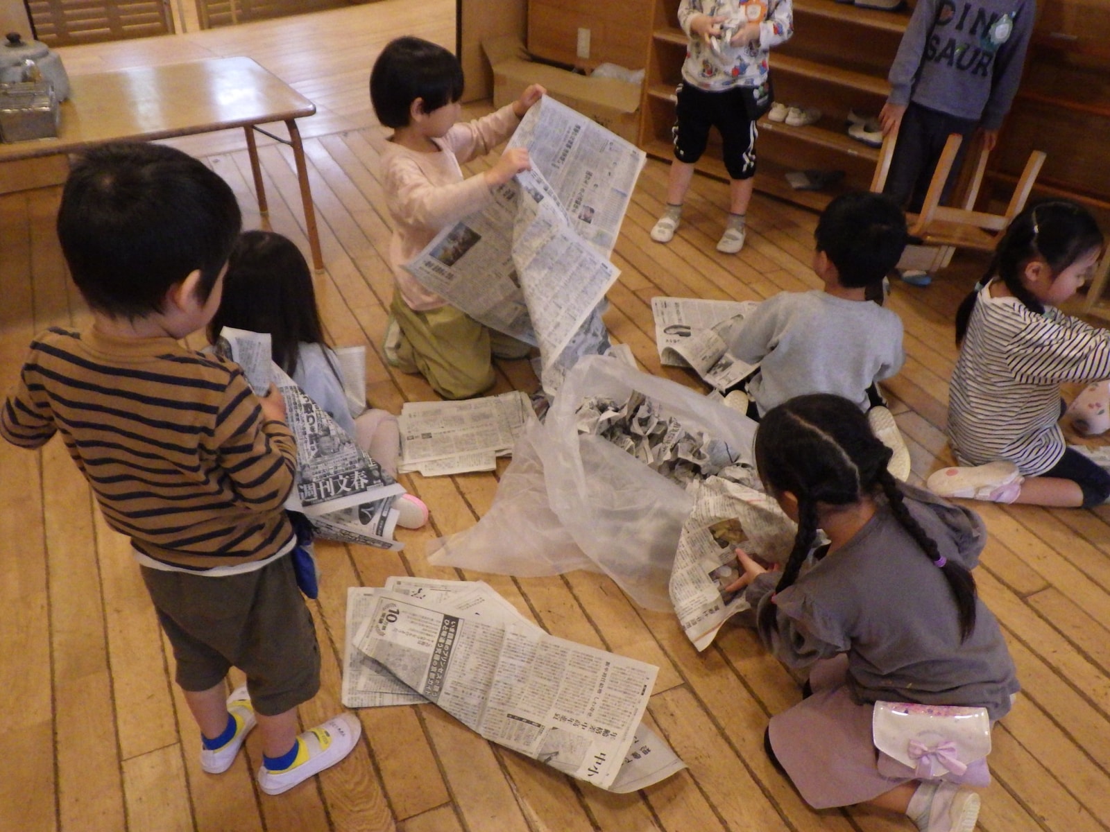 ころがすための大玉作りに挑戦。「新聞紙を丸めようよ」「こっちはいっぱい、そっちは?」声を掛け合い、協力し合うと、あっという間に完成。作ったら「ころがし」てみる。「机を坂道にしてみようよ」どんどん新しいアイディアが生まれていく。