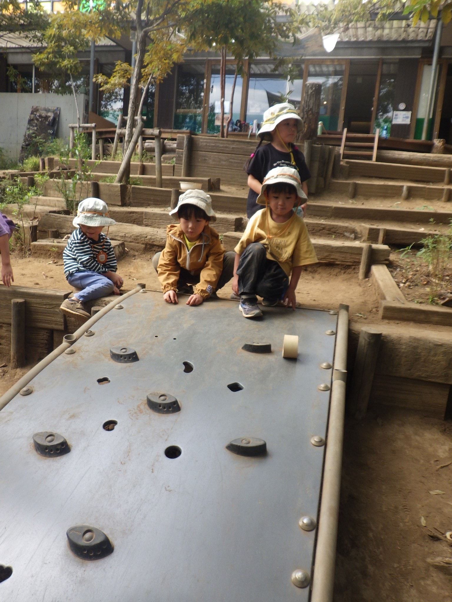 「だいちをどん おやこでどん」に向けて、ころがしたい「ころころチーム」。どんぐりもりで探索すると、目の前にアーチ状の遊具が。どんぐりや竹、ボールをころがしてみると…ころがる!出っ張りにぶつかるところがり方が変わることを発見!遊んでいくうち「穴に落ちなかったら~あたり~」「~はずれ~も作ってみる?」「ちっちゃい子もできるように壁作ってあげよう」と色々な人が楽しめるようにどうするのかの工夫も考えている。