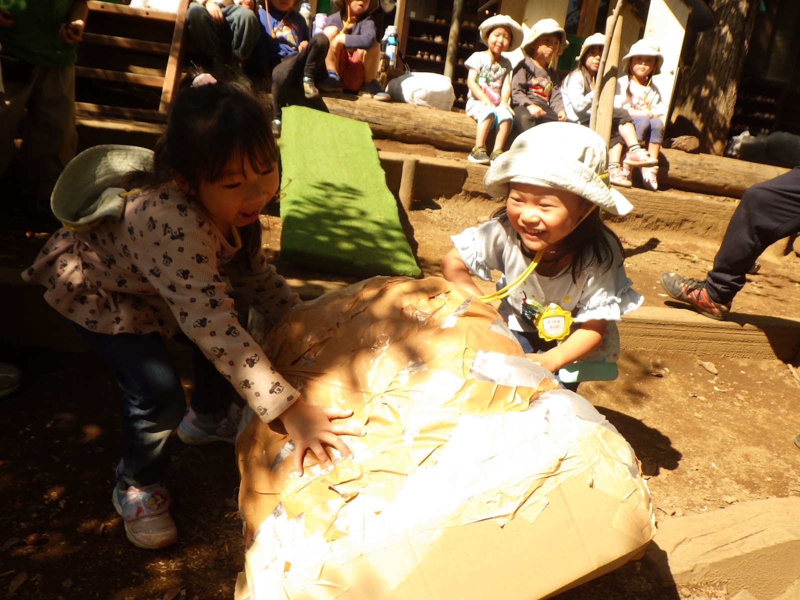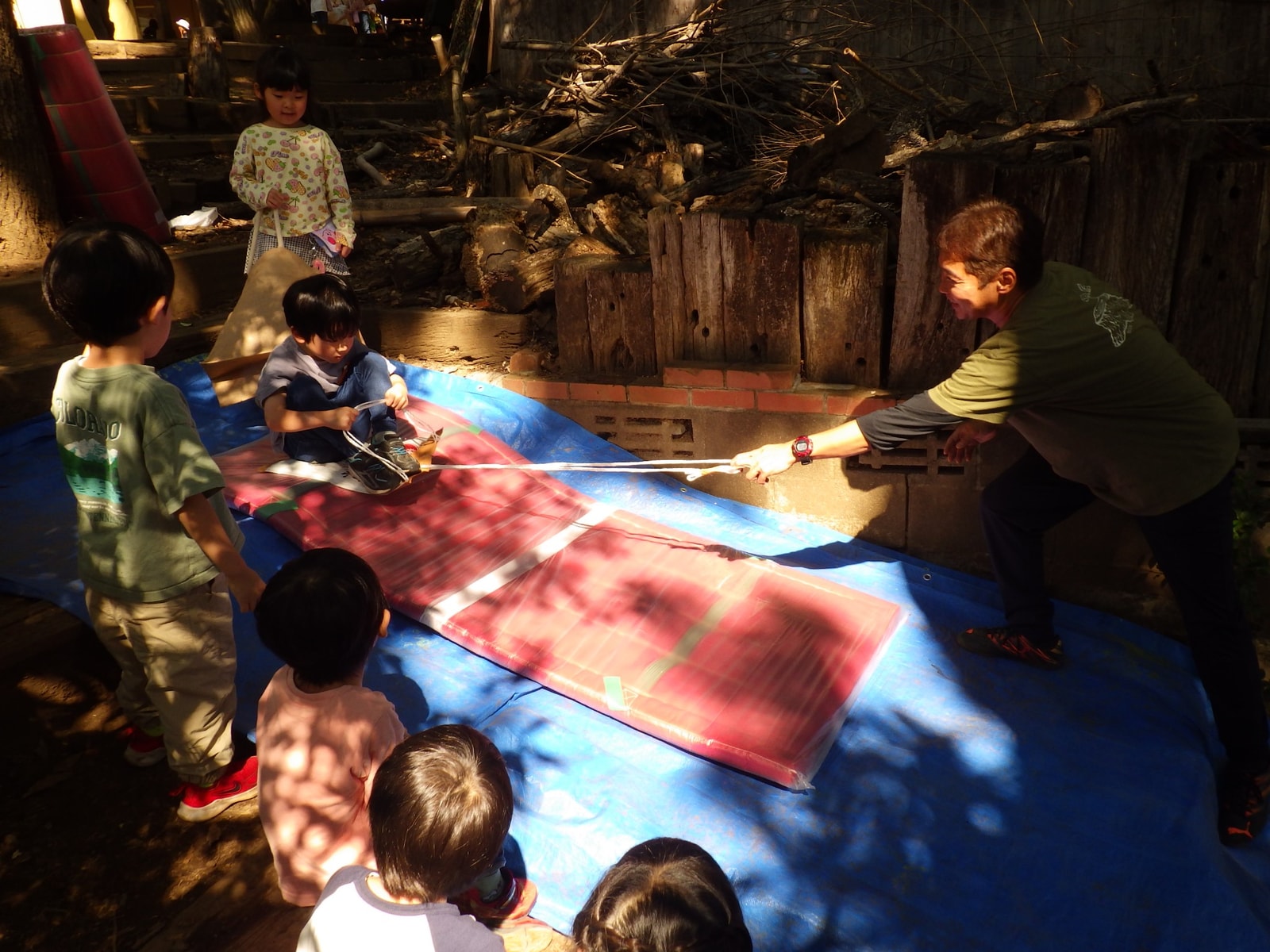 『すべるチーム』と『ころがすチーム』。2つのチームが合体。名付けて、『はしるころころすべりだい』。身体の動きは違った遊びですが、どんぐりもりの立地を使って、遊んでいるので、お互いのアクティビティにも目を向けていく。