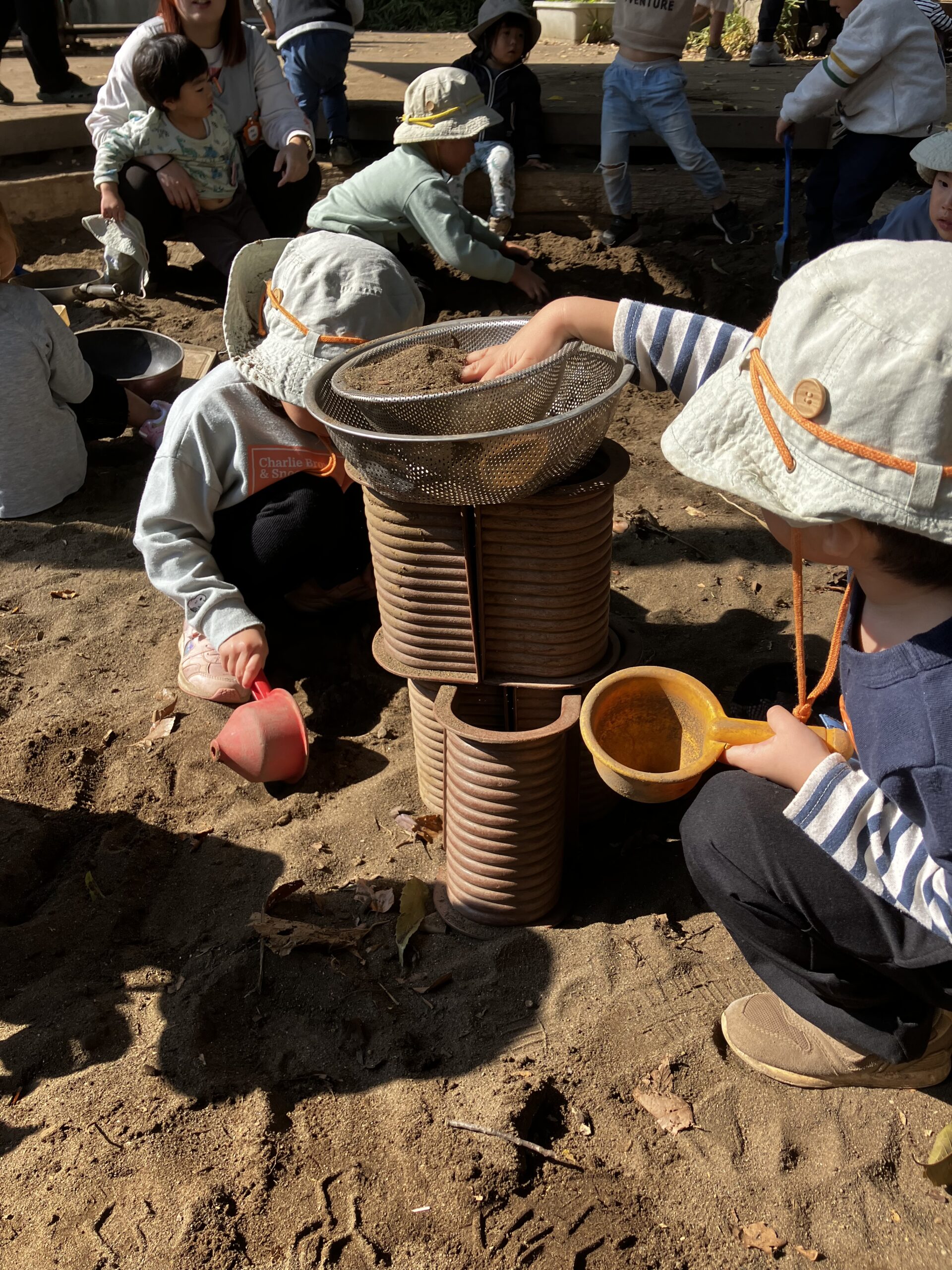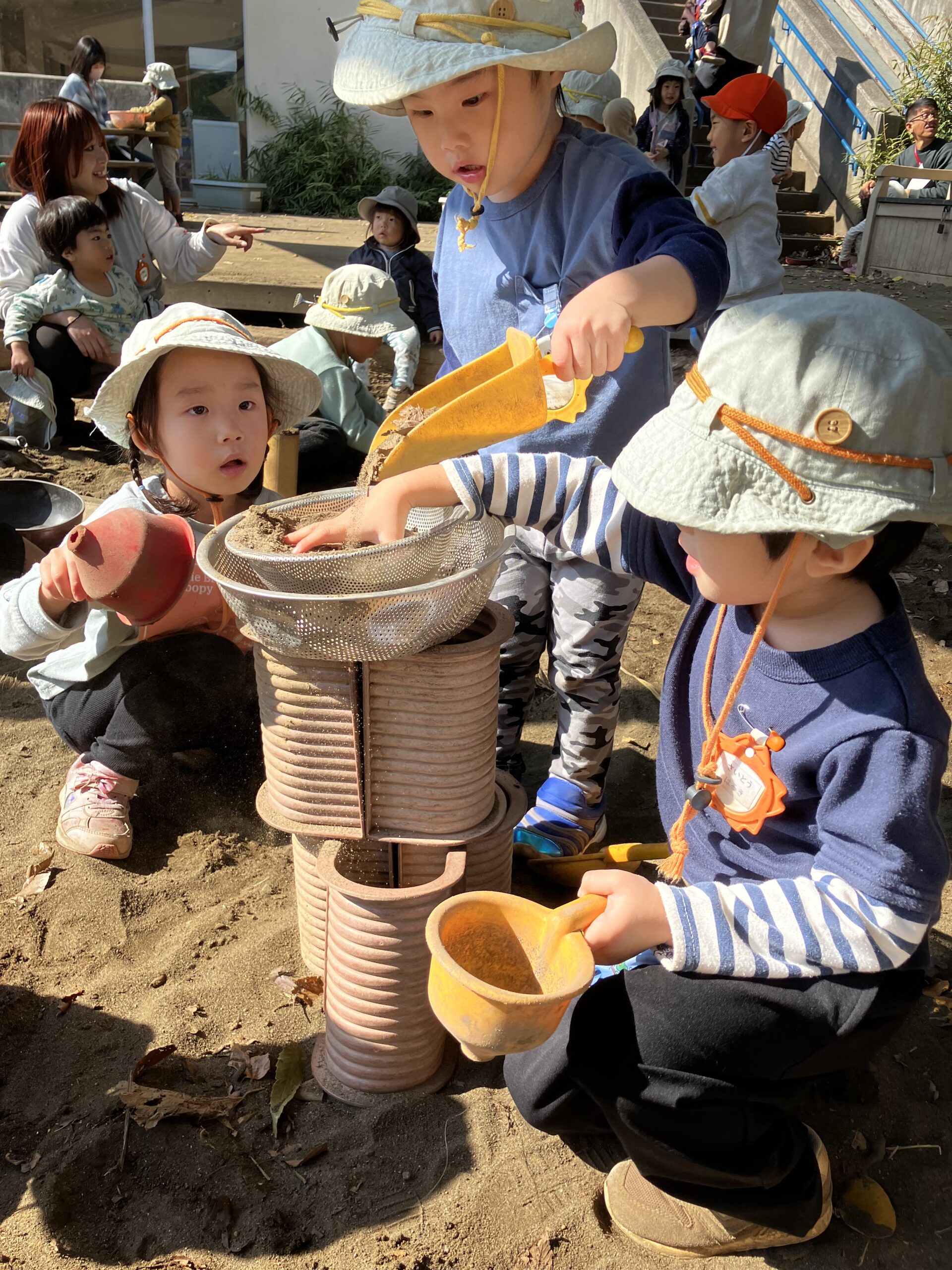 砂場ではいろんな道具を使って、さらさら・・・こっちから入れるね、おさえててね。