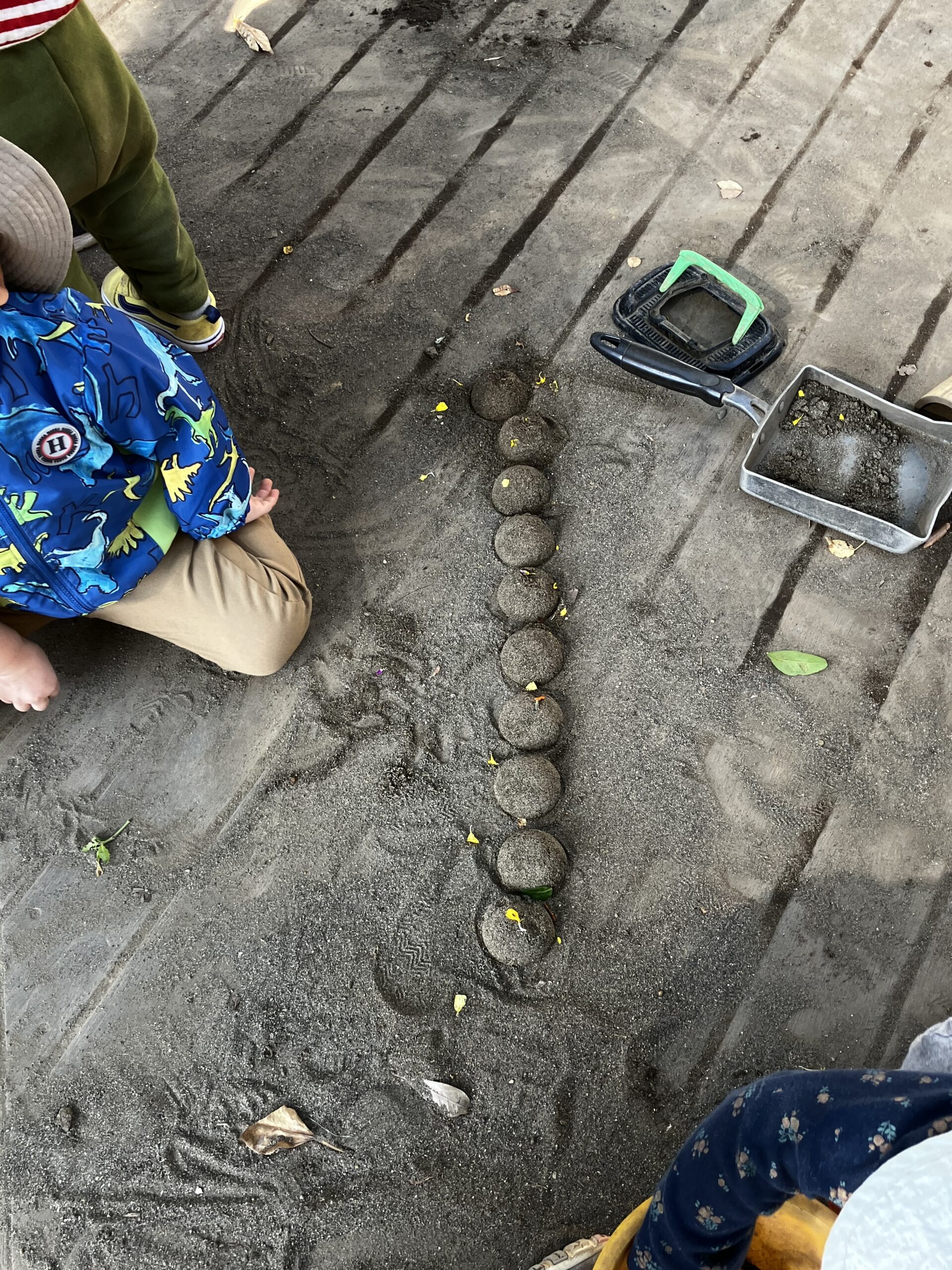 砂はちょっと冷たくて、さらさら、きもちいいね。乾いた砂は、ざるの網目を通り越して、もっともっと「さらさら」になりました。砂でつくったお団子を並べて、ふりかけて・・・おいしそうなおだんごをつかったお料理が出来上がりました。