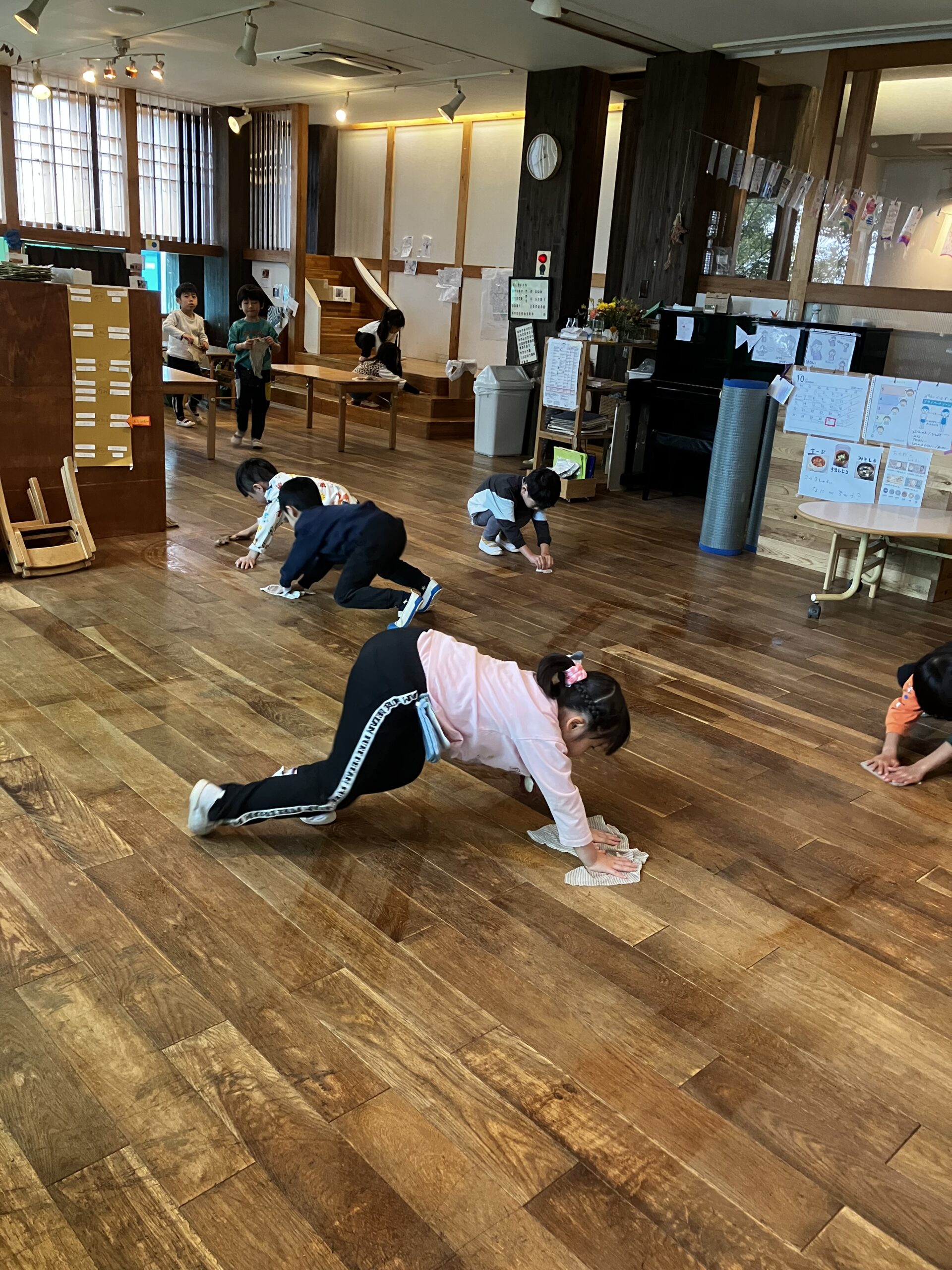 床の雑巾がけ、隅々まできれいになるように…。「みて!きれいになってきたでしょ?」