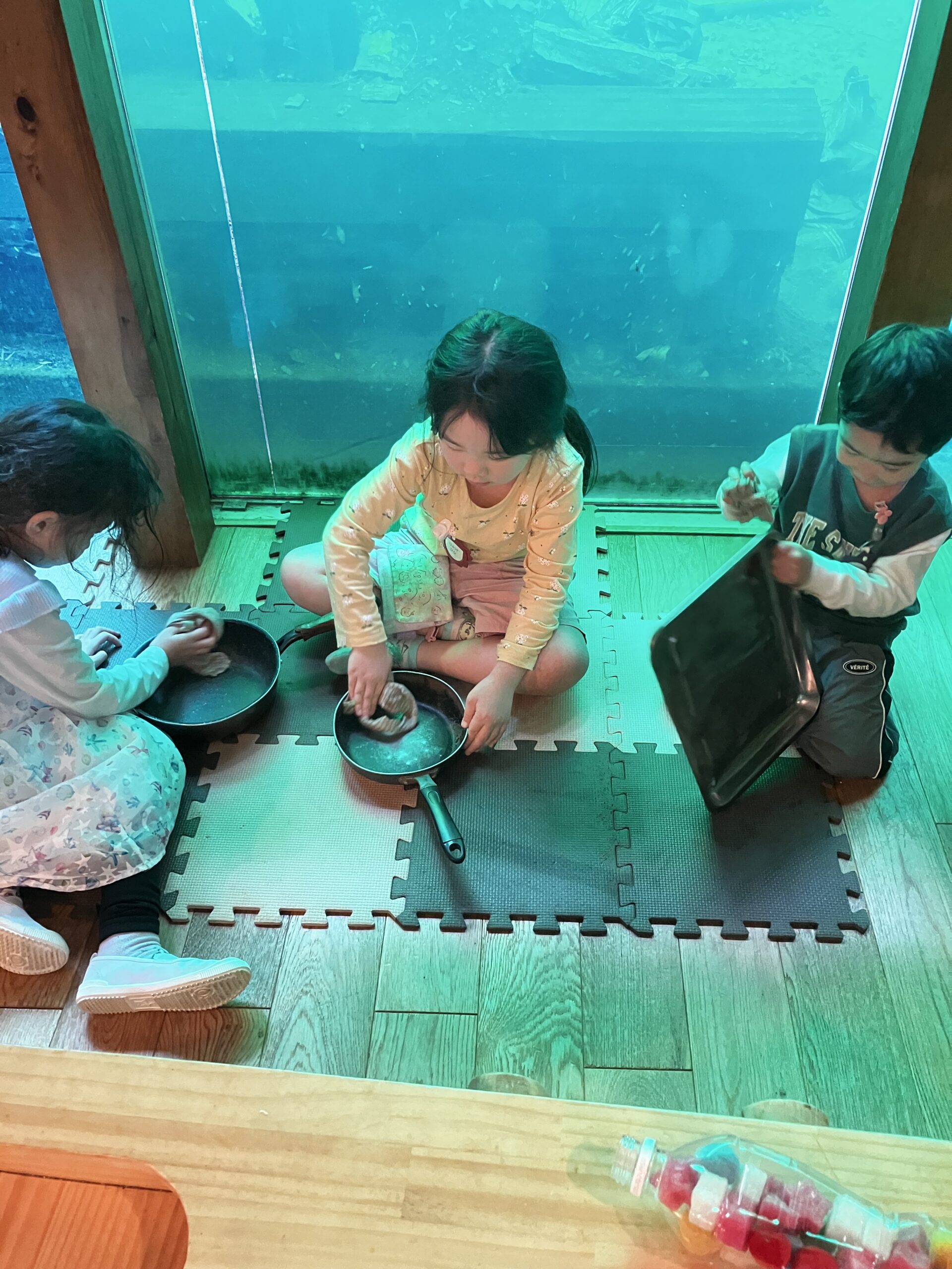 おままごとの道具もピカピカに。「フライパンもお鍋もきれいに拭いて…」