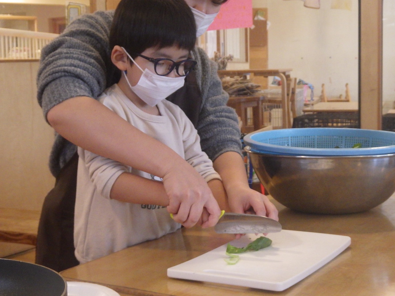 町田自然幼稚園の「もぐもぐふぁーむ」では、今、白菜やちんげんさい、ねぎが食べごろを迎えています。3歳児のれんげ組、昨日収穫したちんげんさいで、今日はクッキング。包丁を使って…。「お家でもやってるよ!」「こうやって持つんだよね」」包丁の使い方を教えてもらって、ひとりひとりチャレンジ!