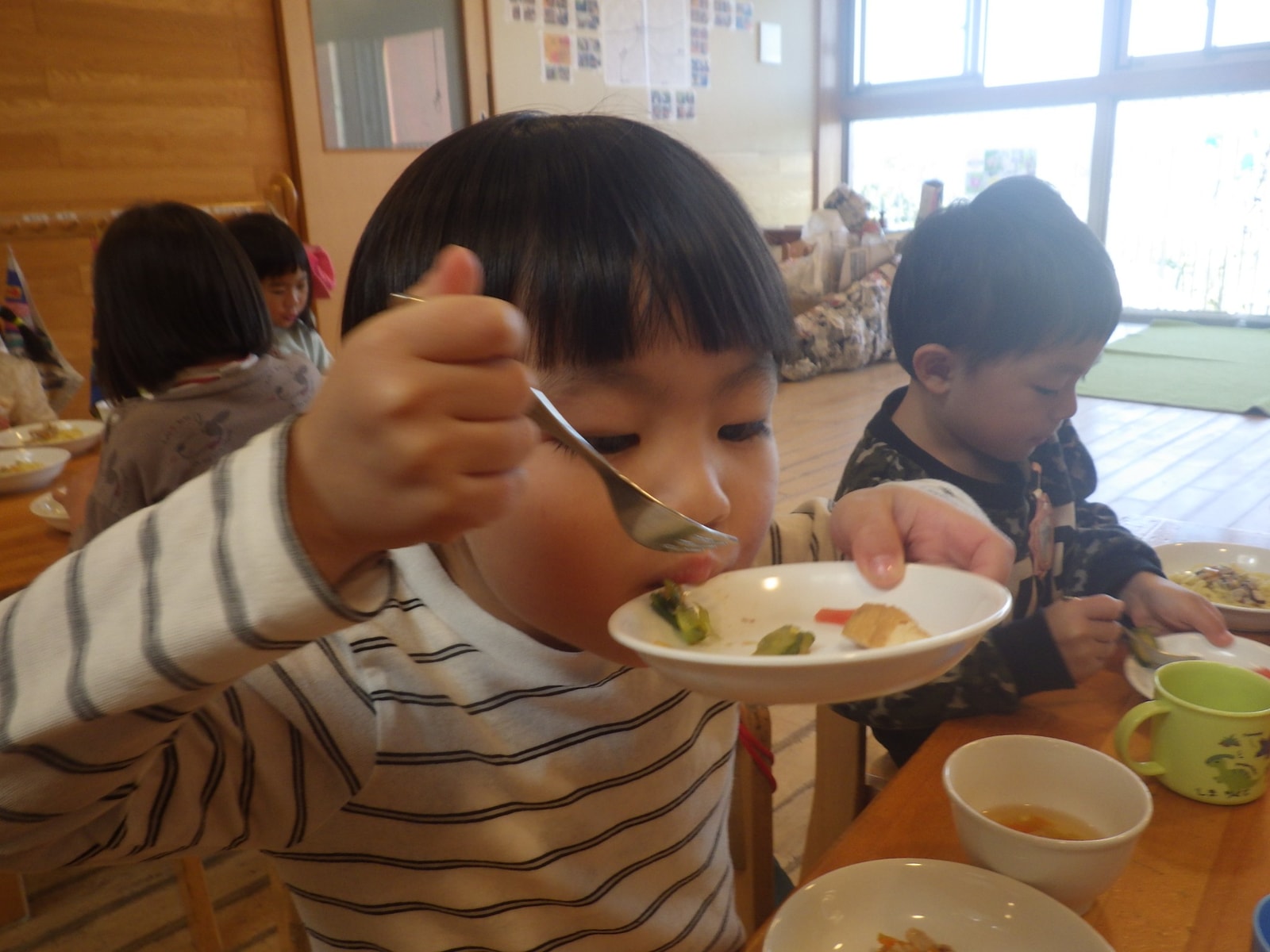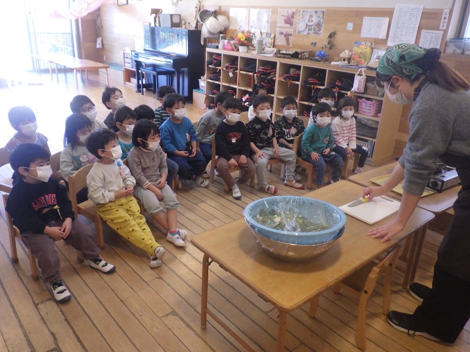 「がんばれ!がんばれ!」と声を掛け合いながら1人ずつ切っていく。切った後はフライパンで炒め、醤油おかか味、昆布味の2種類で味付け。おいしそうな香りに「美味しいにおいする!」「早く食べたい!」と楽しみにする声。食べてみると「おいしい!」「どっちの味も食べてみたいな」「おかわりしたい!」