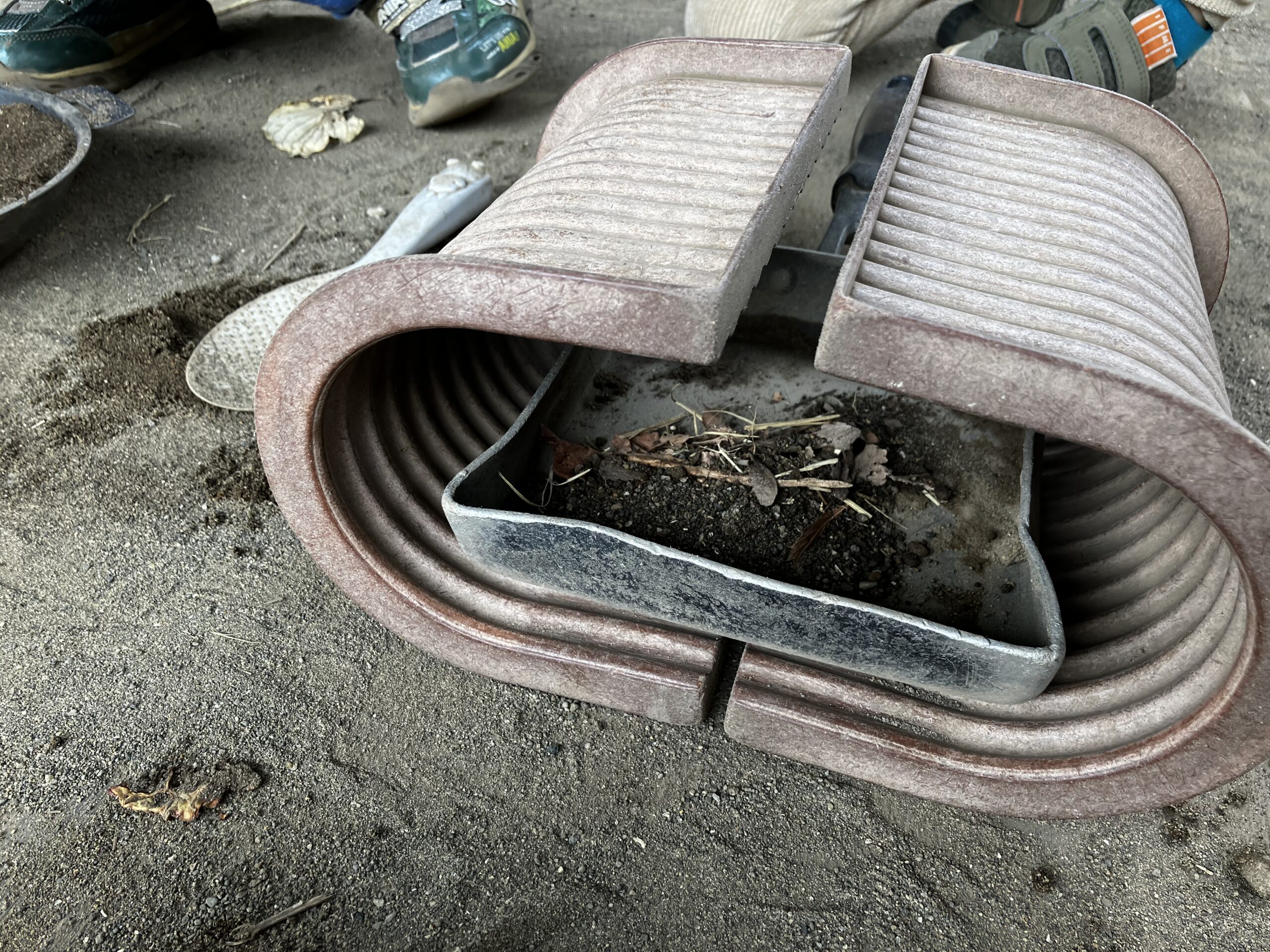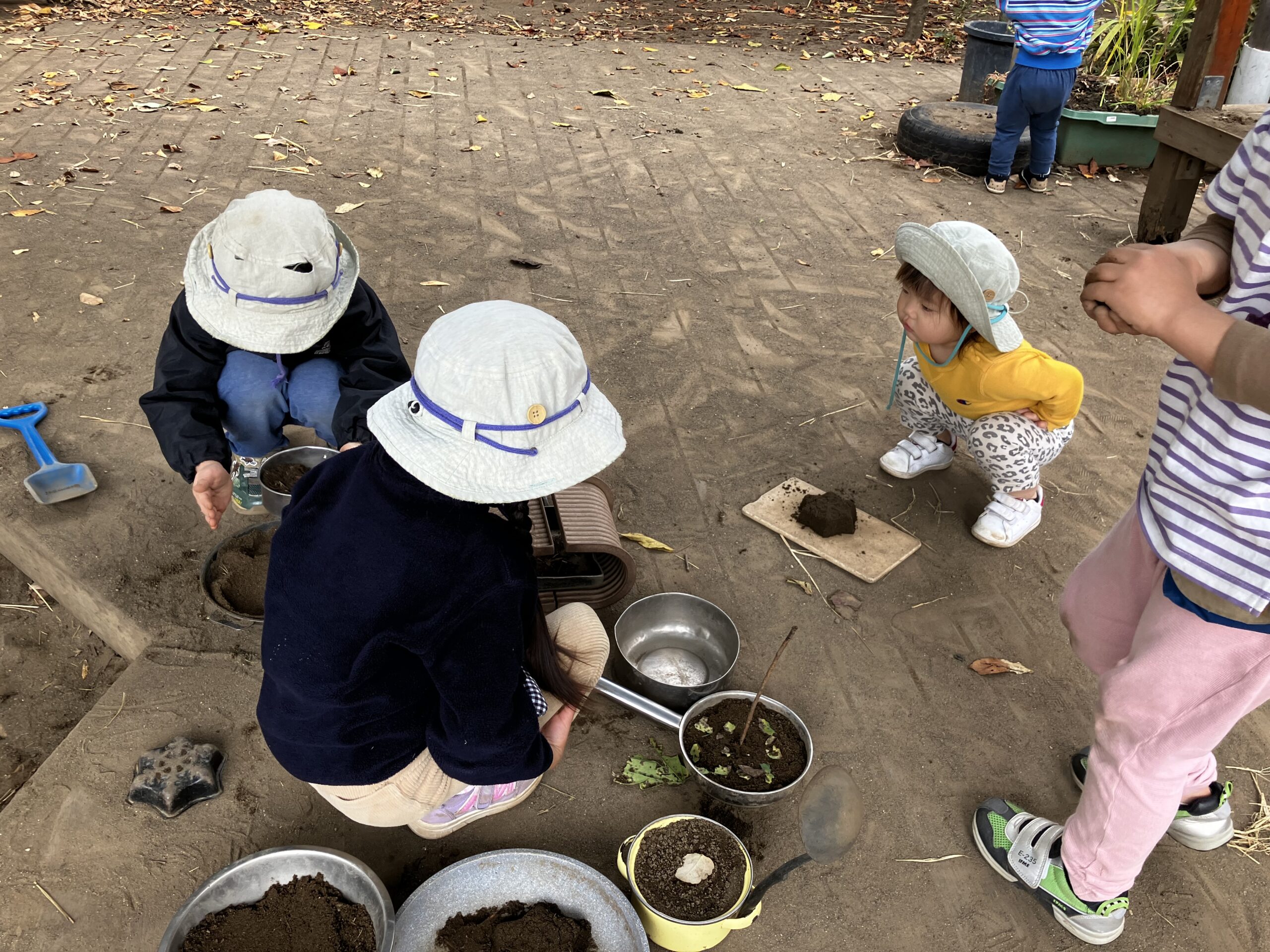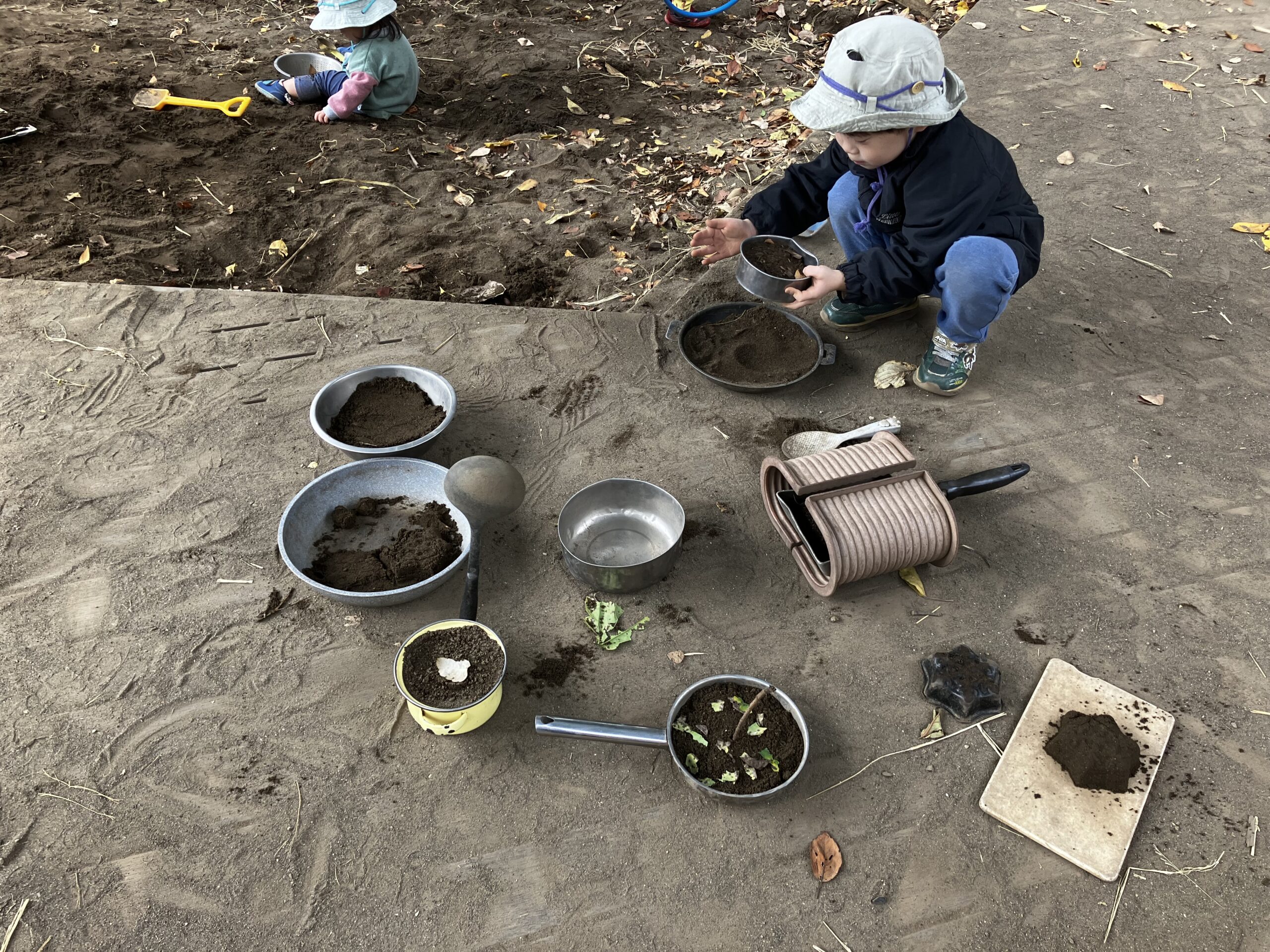 お鍋やフライパンを並べて、お料理が始まります。脇ではふるいで一生懸命品をふるう姿が…手つきも『さま』になっていて。「『ふわふわ』いっぱい作るんだ」「さわってみてごらん!ふわふわだよ」と自分で作った『ふわふわ』な砂。