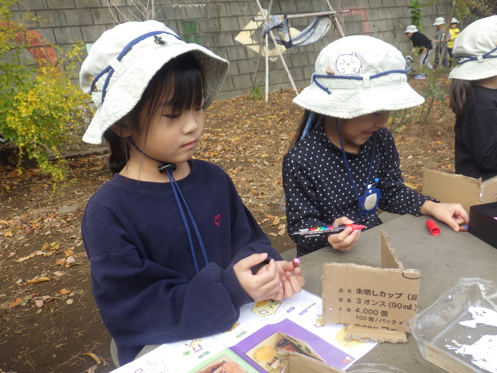 「お風呂出来上がりましたよー」と、できたお家で早速ごっこ遊びをする姿も。「あっちに、不思議なペンがあった!」もぐもぐひろばで、小さな炭を見つけ、「これで書いてみる」。新しい素材を見つけて、作品作りを深める。自然を集めたり、発見したりしたその先の「やってみたい」「作りたい」と意欲的になる姿があふれています。