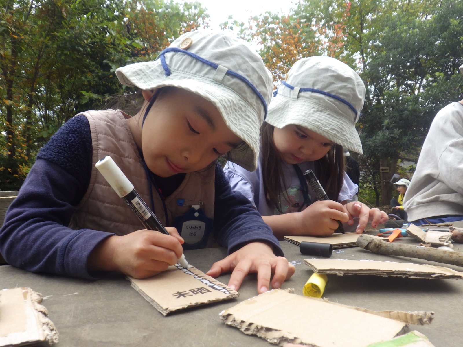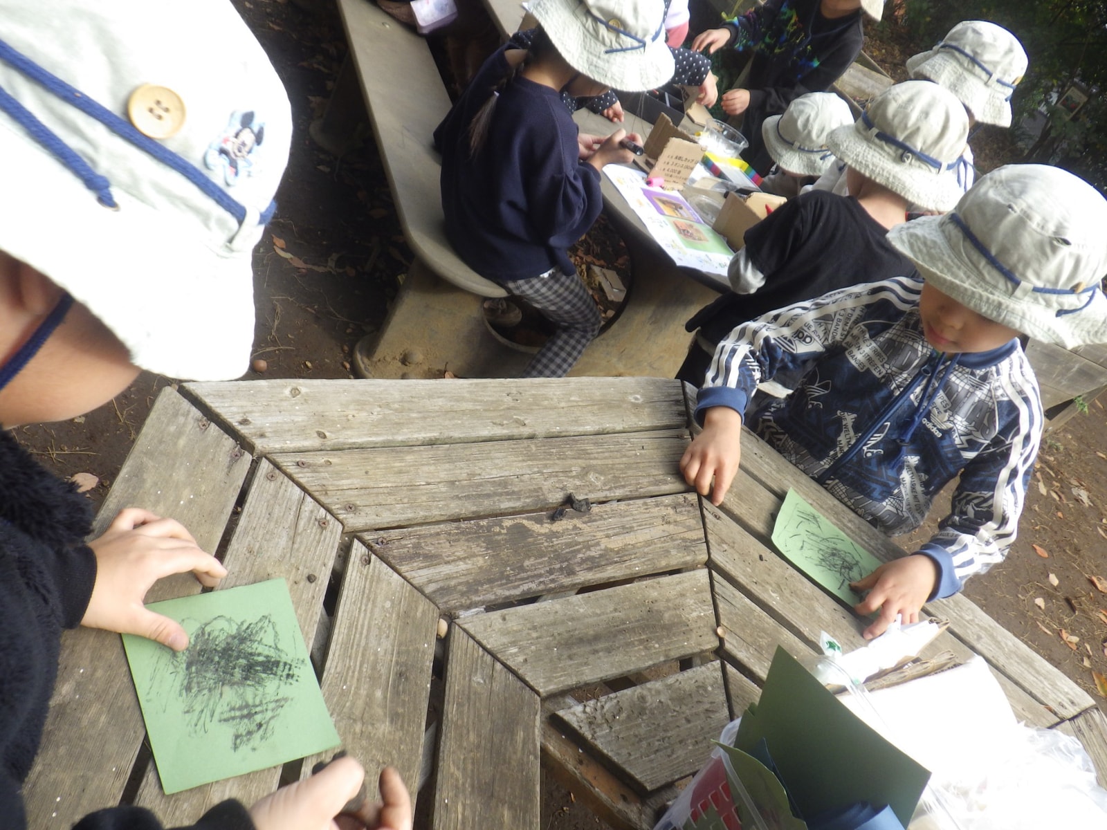 「お風呂出来上がりましたよー」と、できたお家で早速ごっこ遊びをする姿も。「あっちに、不思議なペンがあった!」もぐもぐひろばで、小さな炭を見つけ、「これで書いてみる」。新しい素材を見つけて、作品作りを深める。自然を集めたり、発見したりしたその先の「やってみたい」「作りたい」と意欲的になる姿があふれています。