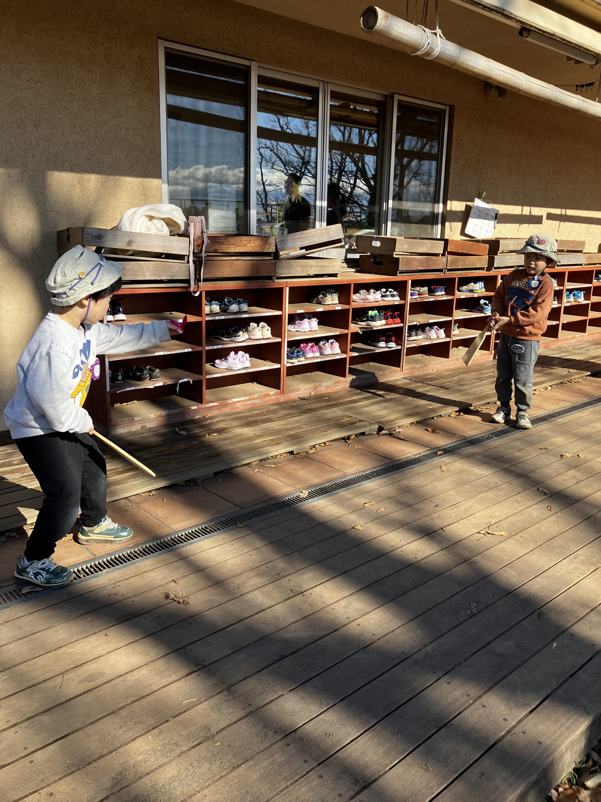 もうすぐお正月、この季節ならではの遊び、「はねつき」の羽根と羽子板が登場しました。久しぶりの青空、風が強いけど、よし、やってみよう!