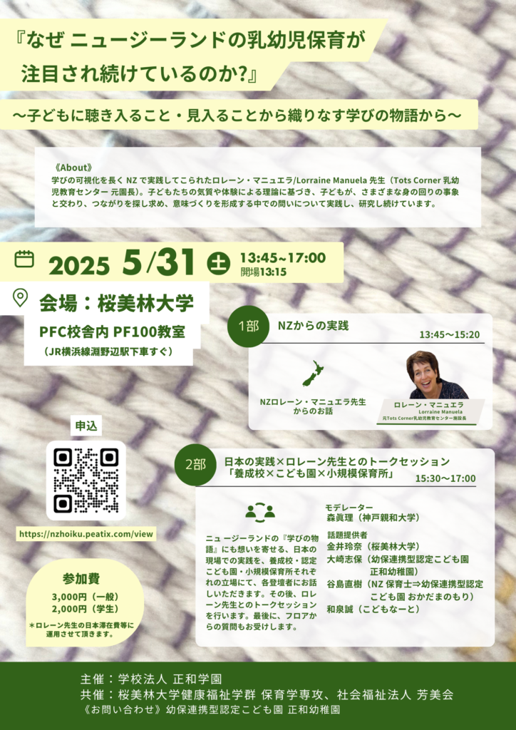 ニュージーランドの『学びの物語』にも想いを寄せる、日本の現場での実践を、養成校・認定こども園・小規模保育所それぞれの立場にて、各登壇者にお話しいただきます。
