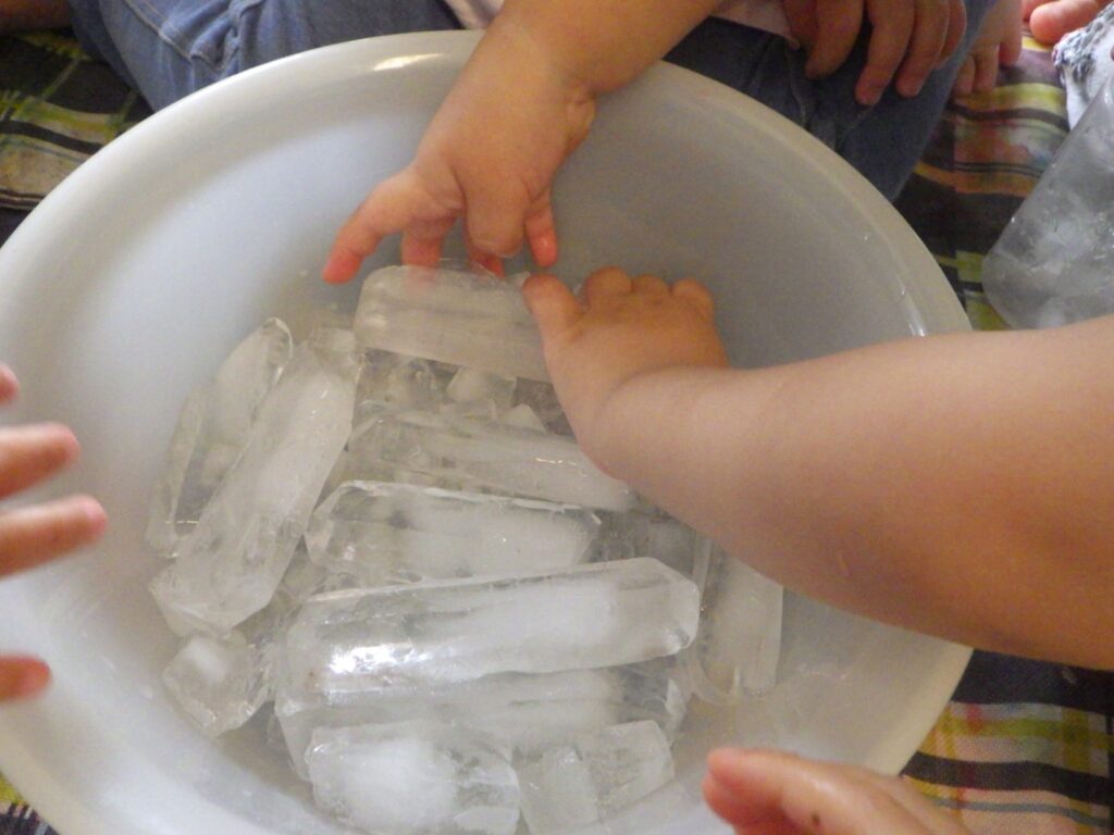 「なんか、でてきたよ?」と体温で氷が融けて水に変わっていきます。