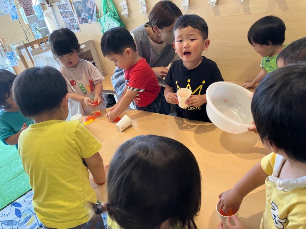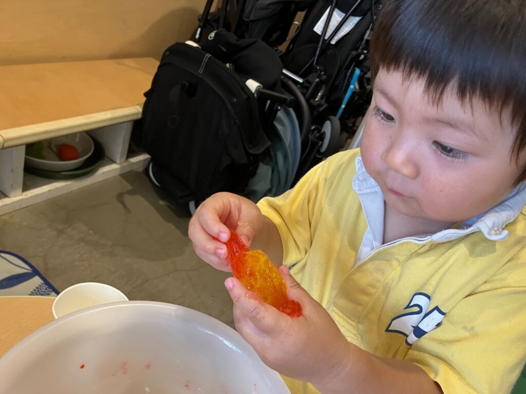 こどもたちにプルプルとしたスライムを見せてみると、初めは恐る恐るでしたが、触ってみるとひんやりと冷たくなっていたようで、「気持ちよい!」と嬉しそう。