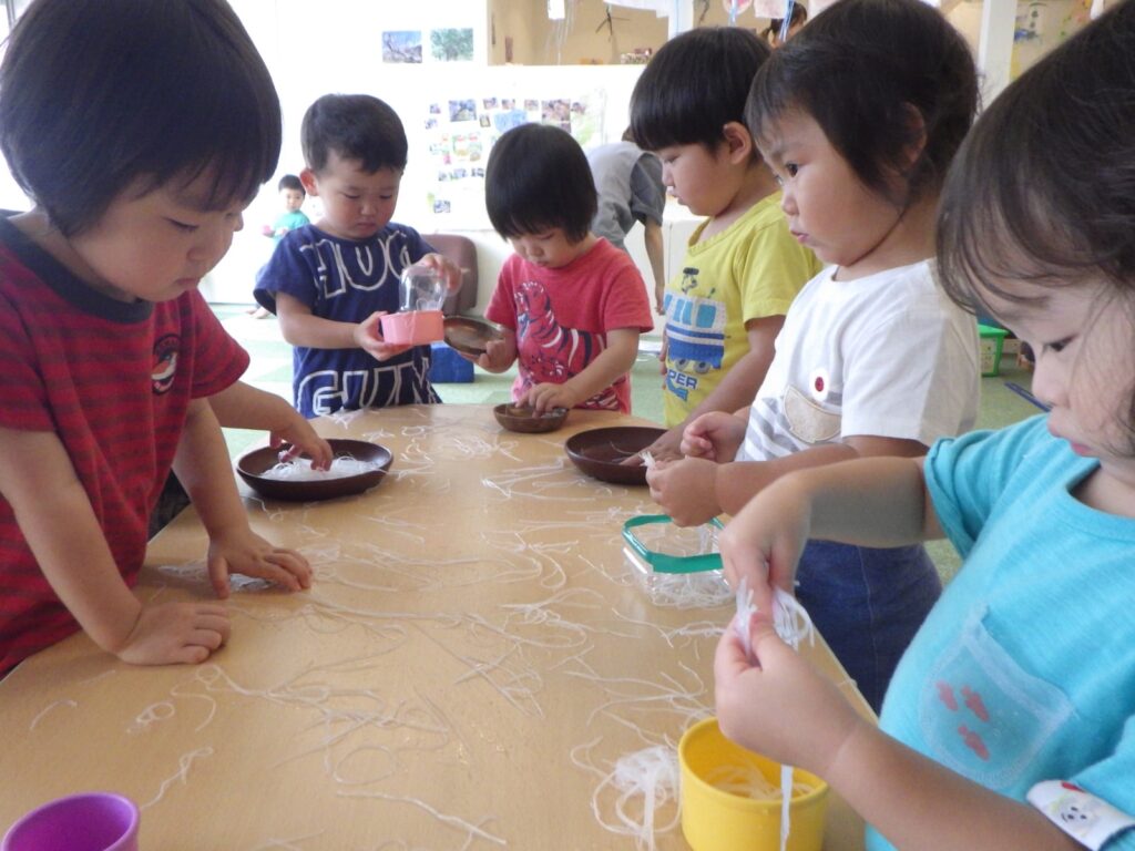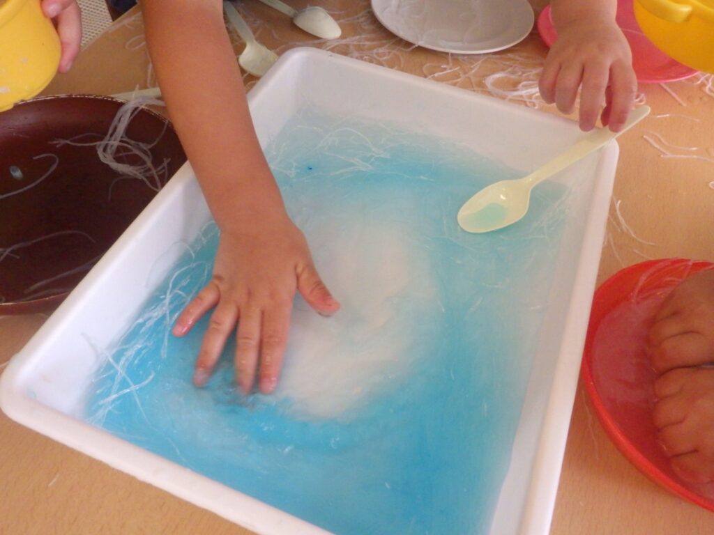 そこからふやかしたものは引っ張ると伸びることを発見したり、おままごとに発展し、蕎麦やうどんに見立ててみたりと遊びの広がりもみられました。