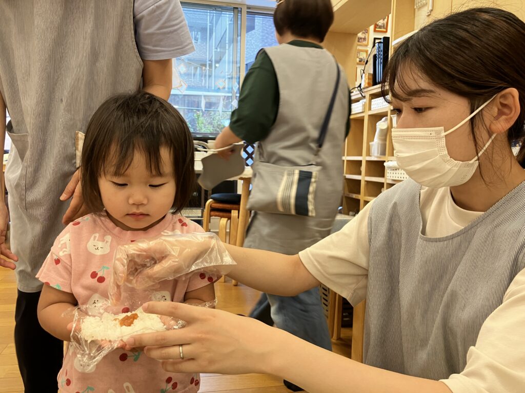 お昼寝のあと、炊きあがったごはんの香りを感じながらおむすびづくり。