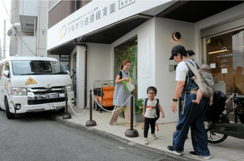 記事では、「送迎保育ステーション」である『つながり送迎保育園・もりの』の取り組みが紹介されています。