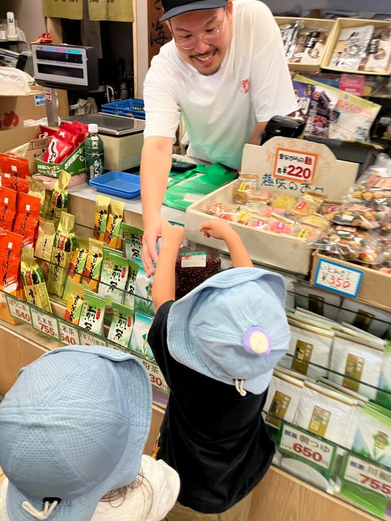 商店街の中を小豆を探して歩いていると河原商店さんのお店に小豆を見つけたこどもたち。「あった!」と嬉しそうに小豆を持ってレジへ。