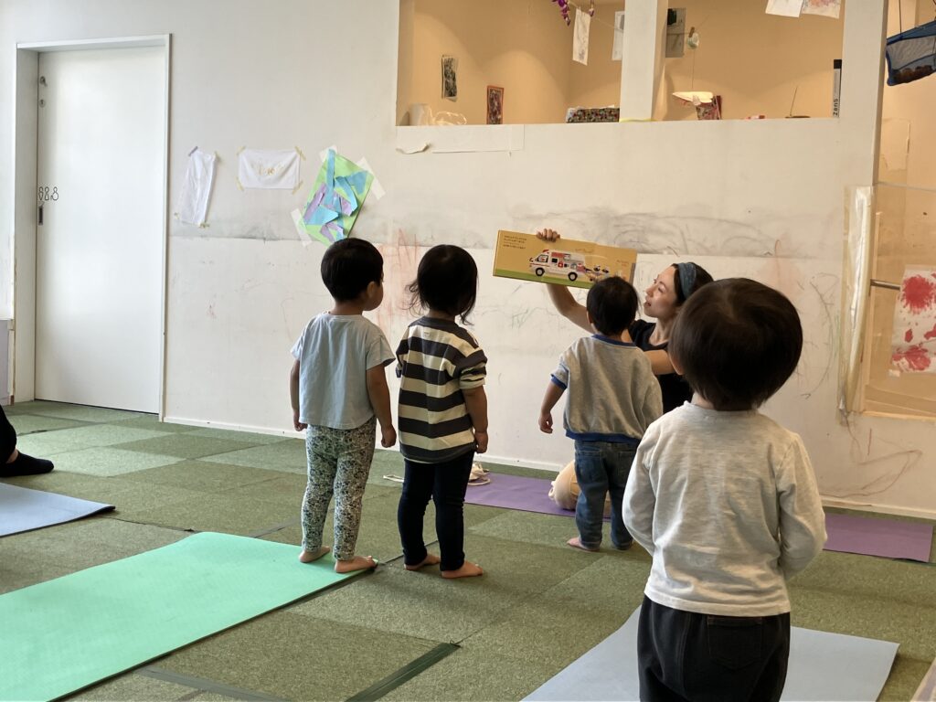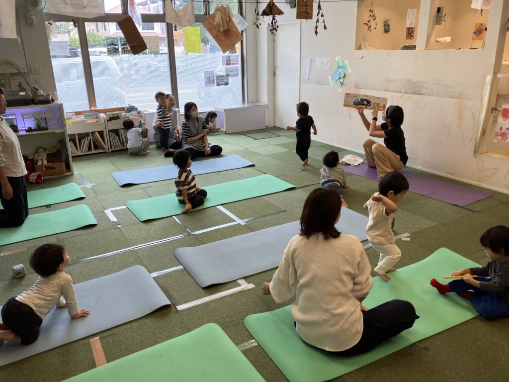 今日は子育てコミュニティ「『おやこふれあいタイム』ゆったりヨガ」を開催しました。今日は参加者だけでなく、つながり保育プロジェクトの土曜日保育で保育園に遊びにきていた子たちも参加をしにきてくれました。