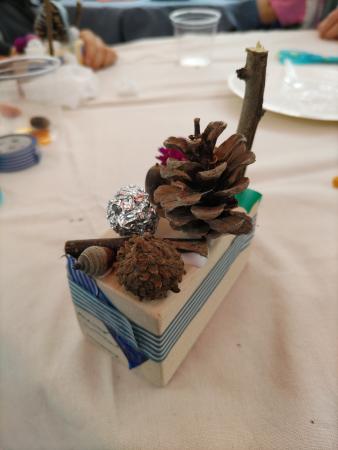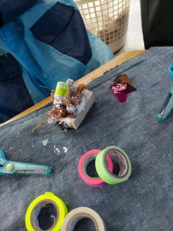 ちいさなアトリエでは、様々な形の木片の中から気に入ったものを選び、布や紙、糸やドライフラワーやどんぐりなどの素材を自由に貼りつけていきます。
