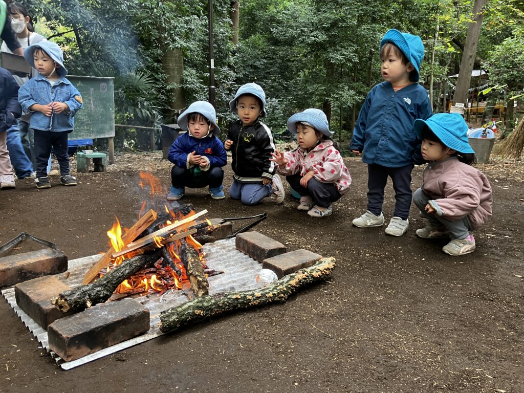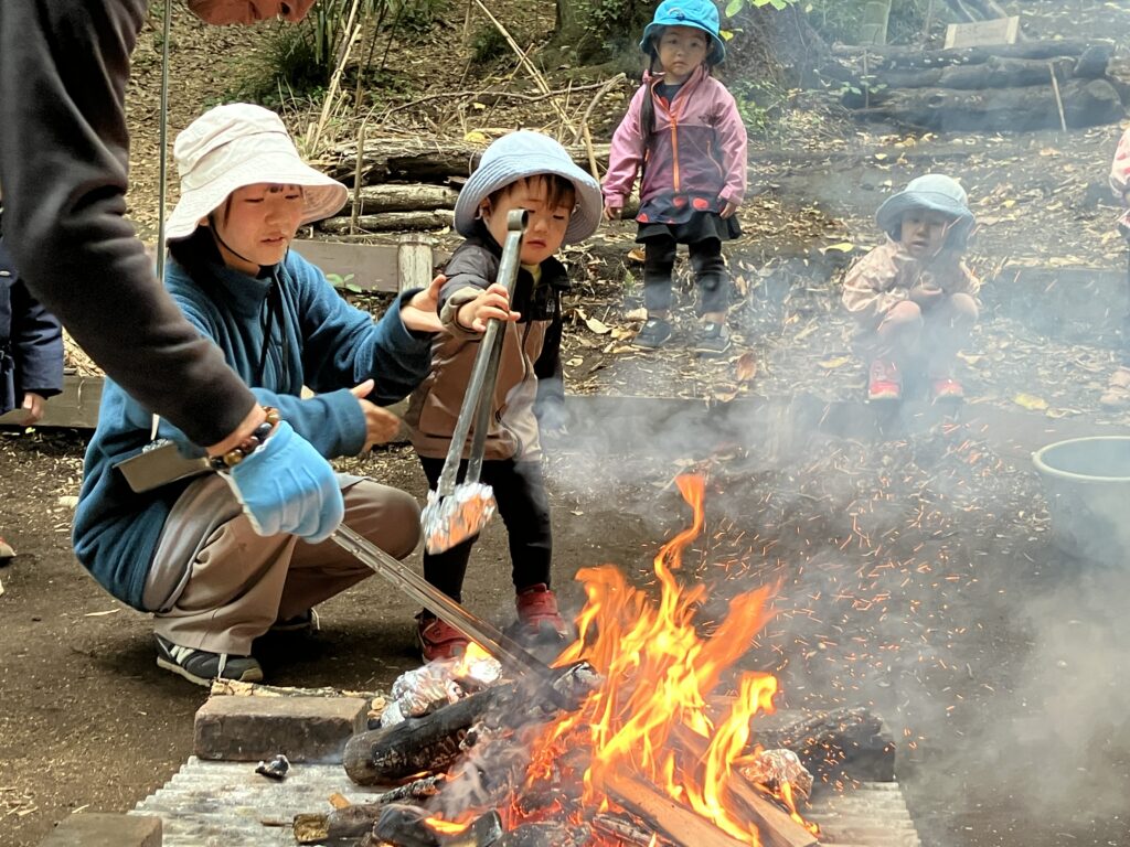 保育者が「焚火でなんでも焼いていいんだよ」と話すと、
