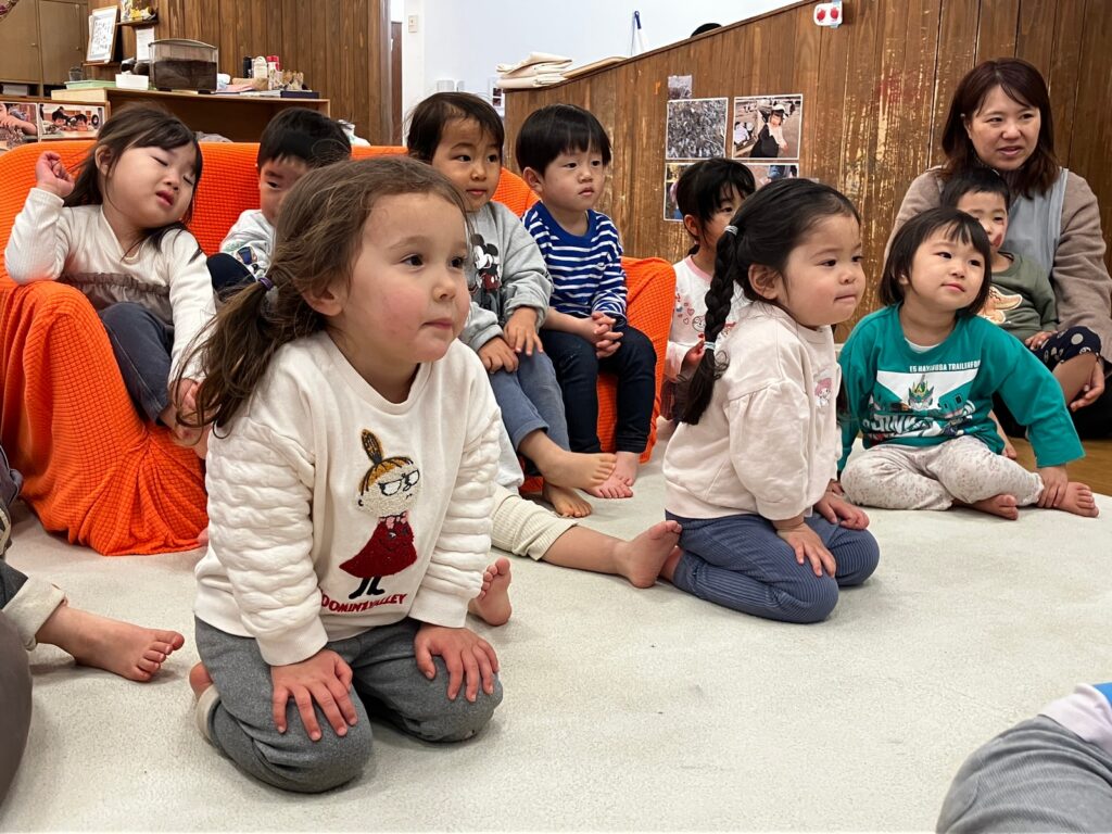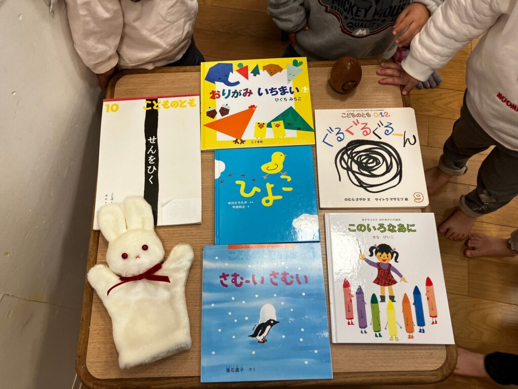 わらべうたにも触れ、最後は子どもたちの中でお気に入りの絵本を選ぶ姿も見られています。