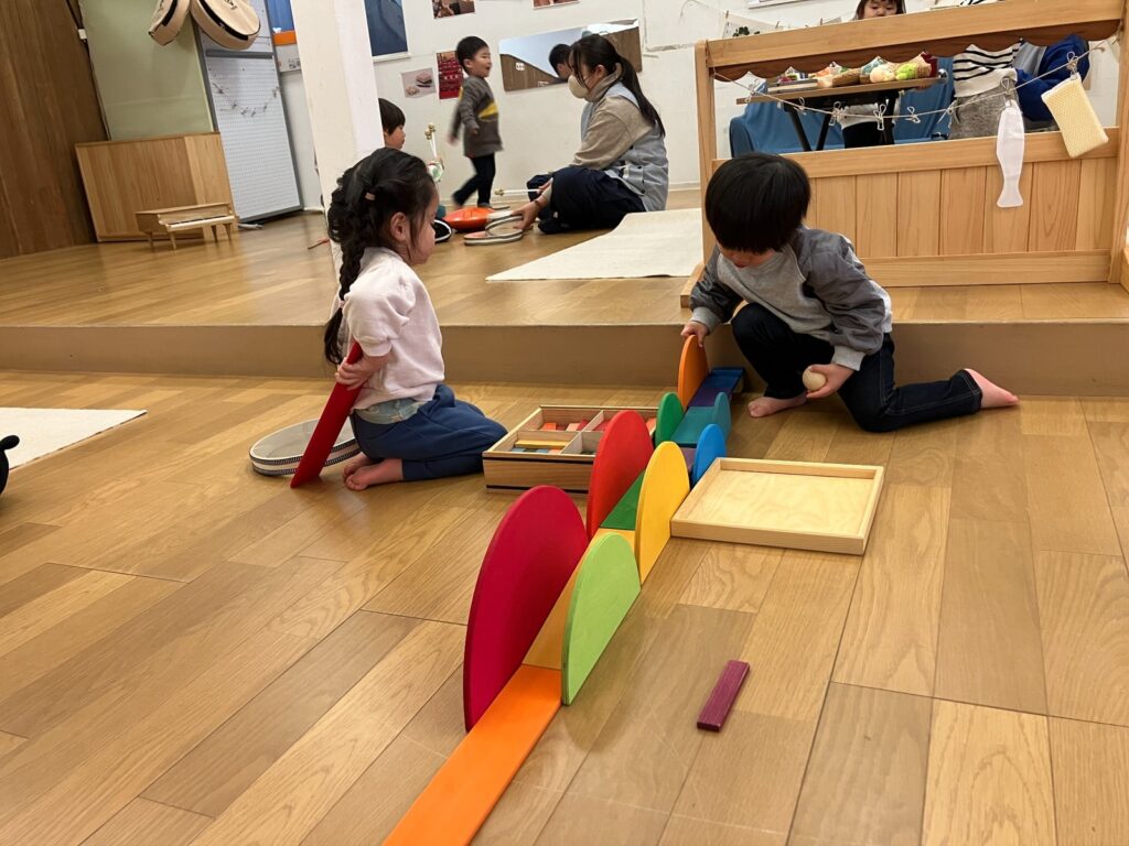坂道の形や転がり方によって音が変わることを感じながら、試したり確かめたりする姿が見られました。