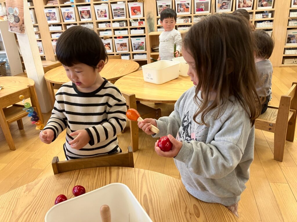 今後も、音の違いに気づきながら、繰り返し試して確かめる姿を大切にし、音と動きや手に伝わる感覚とのつながりを感じられるような遊びを広げていきたいと思います。