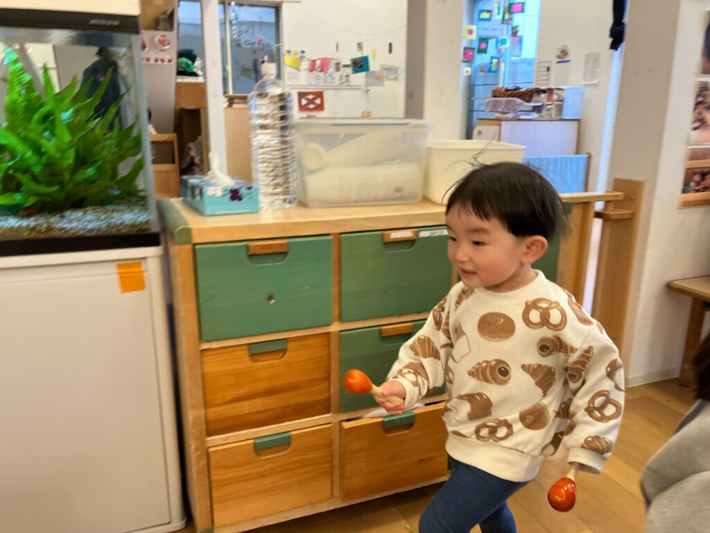 マラカスを持って走っていたお友だちが、「はっ」とした表情で立ち止まりました。
