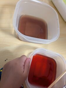 「これにクエン酸を入れるとピンクになるらしいよ」と保育者が言うと、「やってみたい」と。