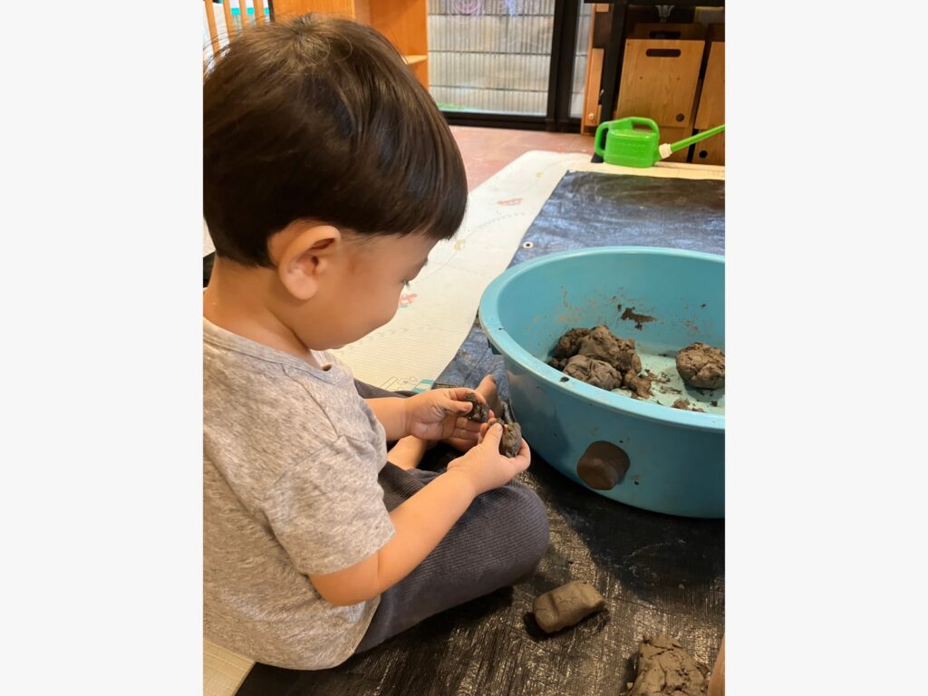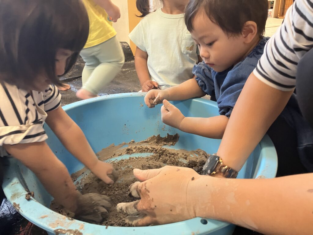 粉末だった土から粘土に変化する様子を実際にみることで土にもいろいろな種類があることを知り、様々な感触をあじわったひとときでした。