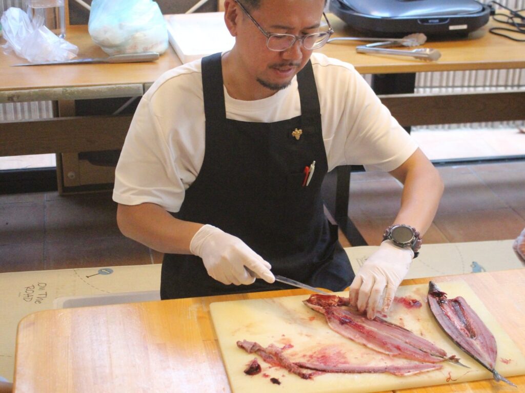 「おさかな先生」ことCara三宿のオーナー北川浩太郎シェフに来ていただき、子どもたちの目の前でおさかなをさばいていただきます。